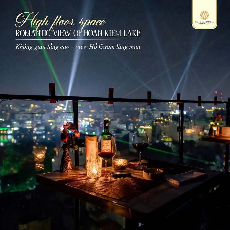 Từ tầng nhìn hướng ra Hồ Gươm thơ mộng hay những con phố nhỏ lung linh ánh đèn, mỗi khung cảnh đều mang lại cảm giác yên bình và đầy thi vị. Khi màn đêm buông xuống, ánh sáng từ những ngọn nến phản chiếu lên ly rượu vang, tạo nên không gian như một bức tranh – nơi mọi cảm xúc đều được khơi dậy nhẹ nhàng.